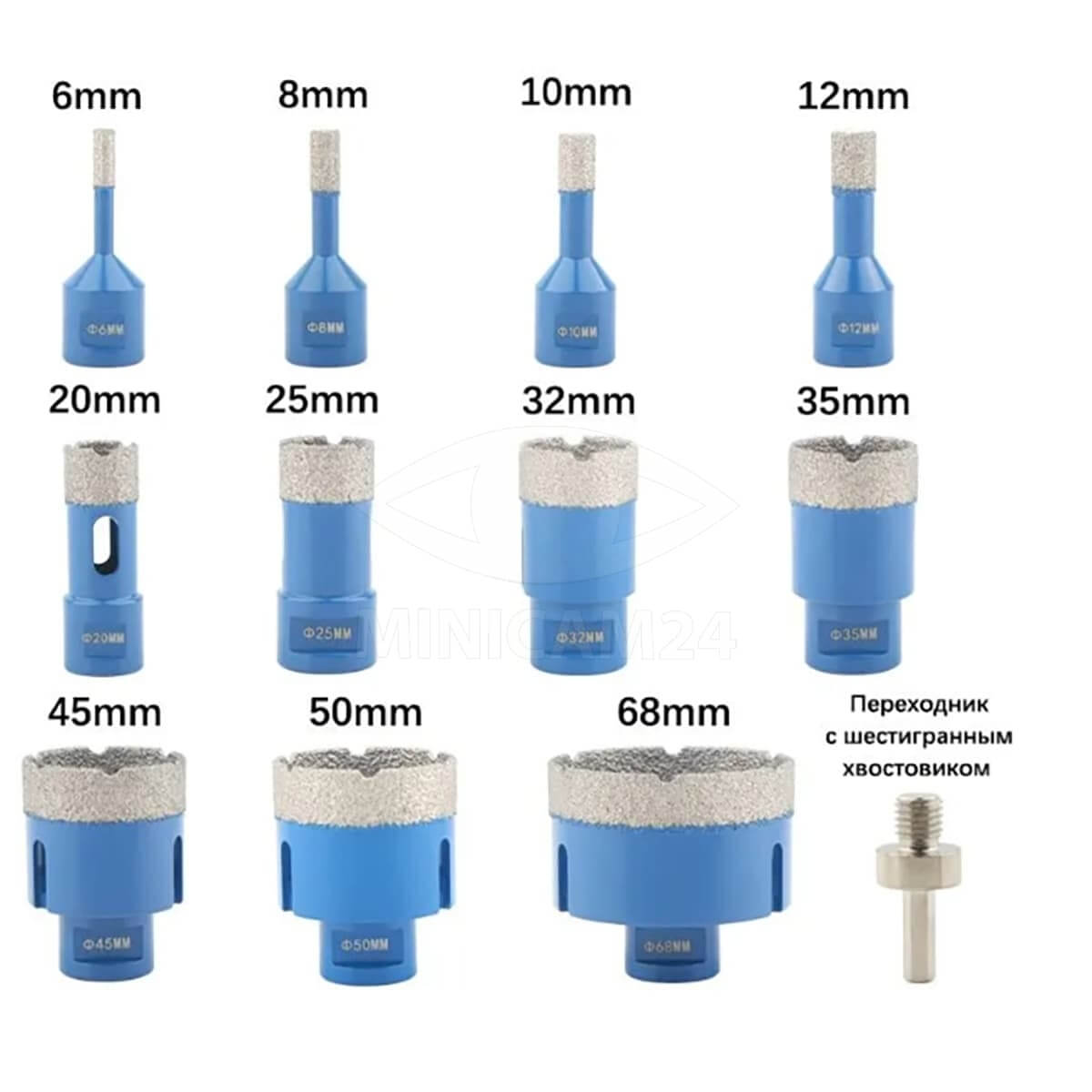 Набор алмазных коронок Oroza — инструмент для выполнения различных задач в строительстве и ремонте. В комплект входит 12 коронок разных диаметров: 6 мм, 8 мм, 10 мм, 12 мм, 20 мм, 25 мм, 32 мм, 35 мм, 45 мм, 50 мм и 68 мм, что позволяет справляться с широким спектром материалов.